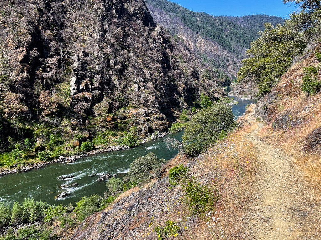 After the lodge, the hiker is given a choice to either continue on a 2-mile segment of the Rogue River Trail that hugs the river along a C-bend, or shortcut over the mountain on the 1-mile Devil’s Backbone Trail. The former is well-maintained and predictable, whereas the latter is brushy and steep. I’ve had enough ticks and close calls with snakes to last a lifetime, so I continue along the river.