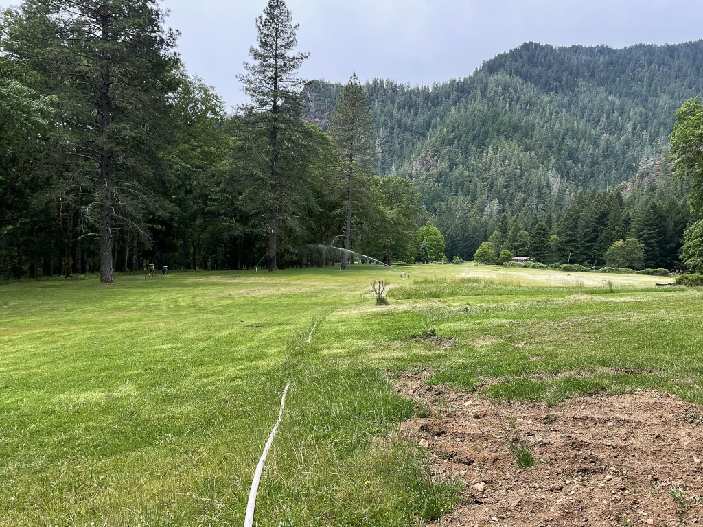 With a long day ahead of me, I quickly shuffle down the trail. Ditch Creek, the next creek down, meets the Rogue River in a languid state. A grassy meadow extends down from the trail to the water–a scene so beautiful it feels master-planned.